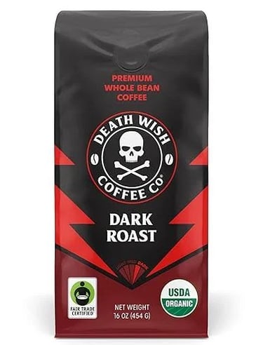 Death Wish Coffee Organic and Fair-Trade Dark Roast Whole Bean Coffee – A top-rated, organic & Fair Trade certified dark roast bean with strong smooth flavor and high overall reviews.
